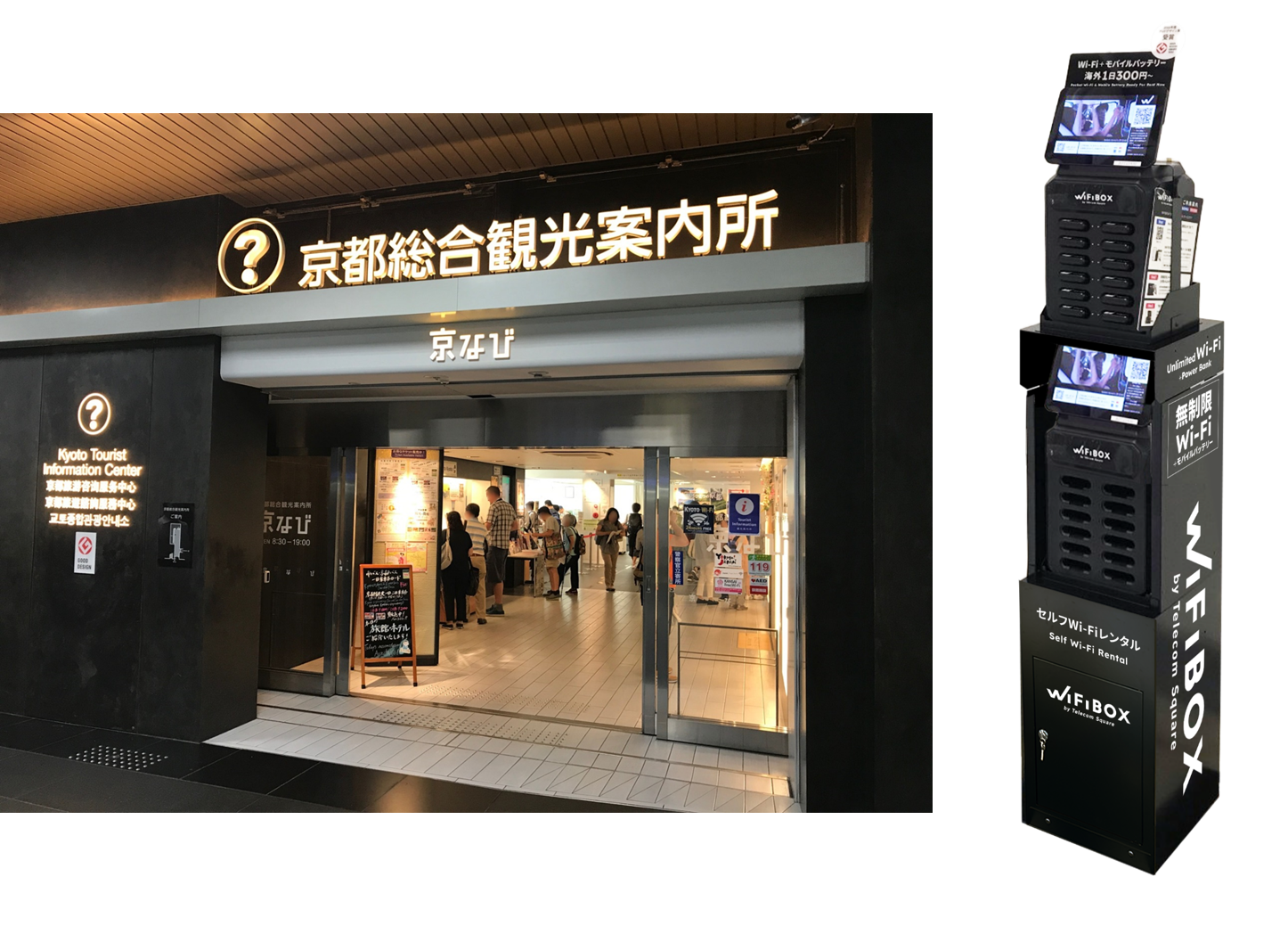 現在は成田空港・羽田空港・関西国際空港をはじめとする全国の主要空港や、東京駅構内、新宿観光案内所、新宿ミロードなど関東圏の市中や商業施設でもサービスを提供しており、国内外で多くのご利用をいただいております。この度、訪日外国人旅行者および国内におけるビジネスや観光、ギガ不足などの利用ニーズに応えることを目的に、関西地区で初の市中設置として、京都駅ビル2階の「京都総合観光案内所 京なび」でのサービスを開始いたします。これによりWiFiBOXの設置箇所は計13施設・18箇所となりました。今後も関西エリアでのさらなる展開に加え、順次、国内の設置を進め、よりお客様の利便性の向上を目指してまいります。