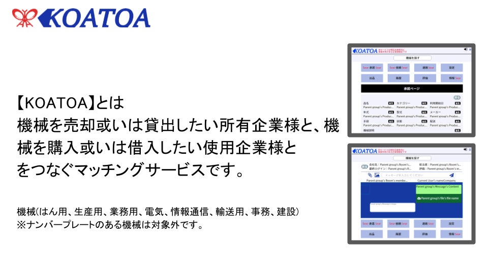 【KOATOA】では企業間で機械の売買だけでなく賃貸も可能です。土日だけ使用しない場合土日だけ貸し出すことが可能です。さらに配送せずに所有企業様の工場等に使用企業様が訪問して利用してもらうこともできます。それにより稼働率を向上でき所有者様使用者様双方にとって有意義な取引となります。近隣で機械の貸し借りができれば、設備投資にお金をかけず過度な設備投資による失敗を避けることができます。