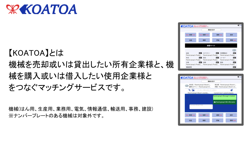 忙しかったり、人員がいなくてサービスを使えないという企業様もご安心ください。【KOATOA】ではお任せプランもご用意しております。メールなどいただければ弊社営業が機械のリスト作成から出品相手との交渉から契約までを代行いたします。契約が確定したら所有者様が使用の段取りのみをお願い致します。お任せ手数料として本体価格の5%を㈱KOATOAへ支払いが必要ですが、新たに営業マンを一人採用するよりもご納得いただける内容となっております。メールか問い合わせ弊社問い合わせフォームからご連絡ください。