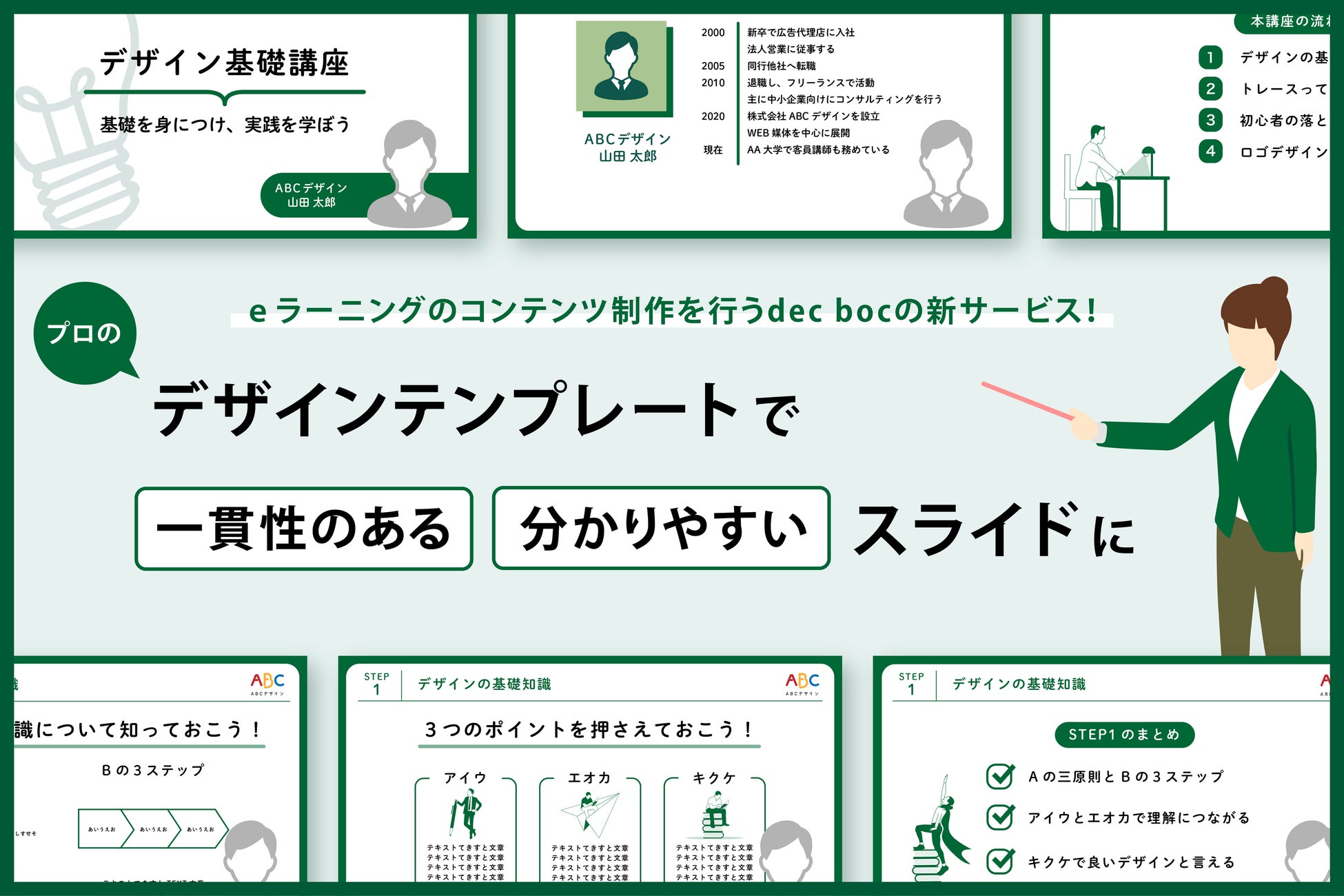 システム開発に強みを持つMogicと、コンテンツ制作に強みを持つdec boc。今後、両社の強みを活かした新サービスを続々と展開いたします。第1弾として、eラーニング用スライドテンプレート制作サービスをリリースします。本テンプレートを使用することで、一貫性のある高品質なスライドを短時間で作成することが可能となります。