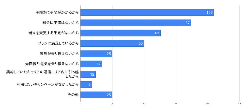 さらに「料金に不満はないから」「端末を変更する予定がないから」「プランに満足しているから」などの理由も多いため、現状に満足している方が多いことが考えられます。
