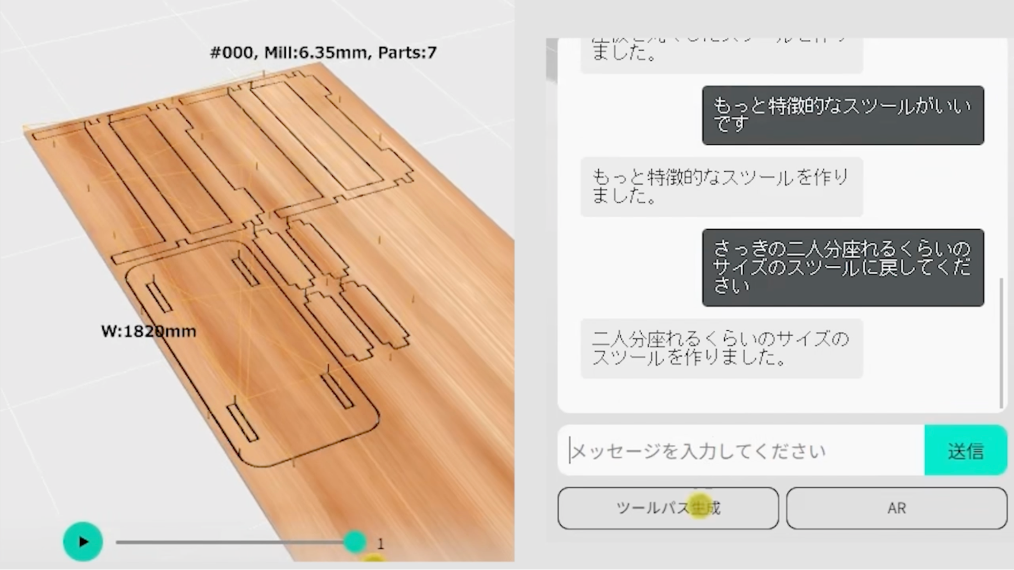 つくりたいもののイメージを、AIに伝えるだけでデザインモデルが出来上がるため、CADやillustrator等の設計ソフトを使えない方や、設計スキルがない方でも、イメージ通りの家具や空間をつくることができます。また、デザインの補助ツールとしてもご利用可能です。