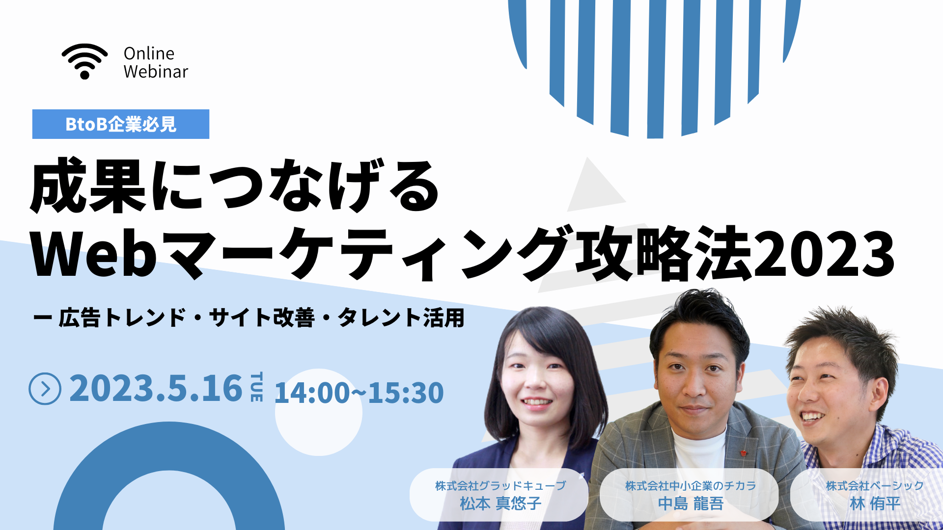 <14:00~14:05> ご挨拶 <14:05~14:30> Web広告の最新トレンドと重視するべきポイント 登壇者:株式会社グラッドキューブ マーケティングソリューション事業部 松本 真悠子 <14:30~14:55> タレントを活用したマーケティング戦略 登壇者:株式会社中小企業のチカラ 中島 龍吾 <14:55〜15:20> Webサイトのパフォーマンスを最大化する効果測定 登壇者:株式会社ベーシック ferret One事業部 マーケティング部 マネージャー 林 侑平 <15:20〜15:30> 質疑応答 |