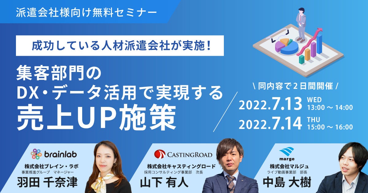 明日から取り組みたい集客部門が行うべき売上UP施策を、派遣業界の事例を多く持つ3社が7/13(水)、7/14(木)の2日間にわたり徹底解説します!