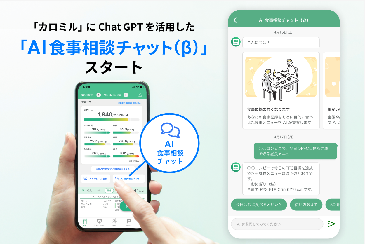 そこで、ユーザーの食事改善の行動を後押しする機能として、Open AIが開発した「Chat GPT」を活用し、AIによる対話型「AI食事相談チャット(β)」を追加しました。これにより、ユーザーは1週間の食事データをもとにした食事アドバイスが得られます。