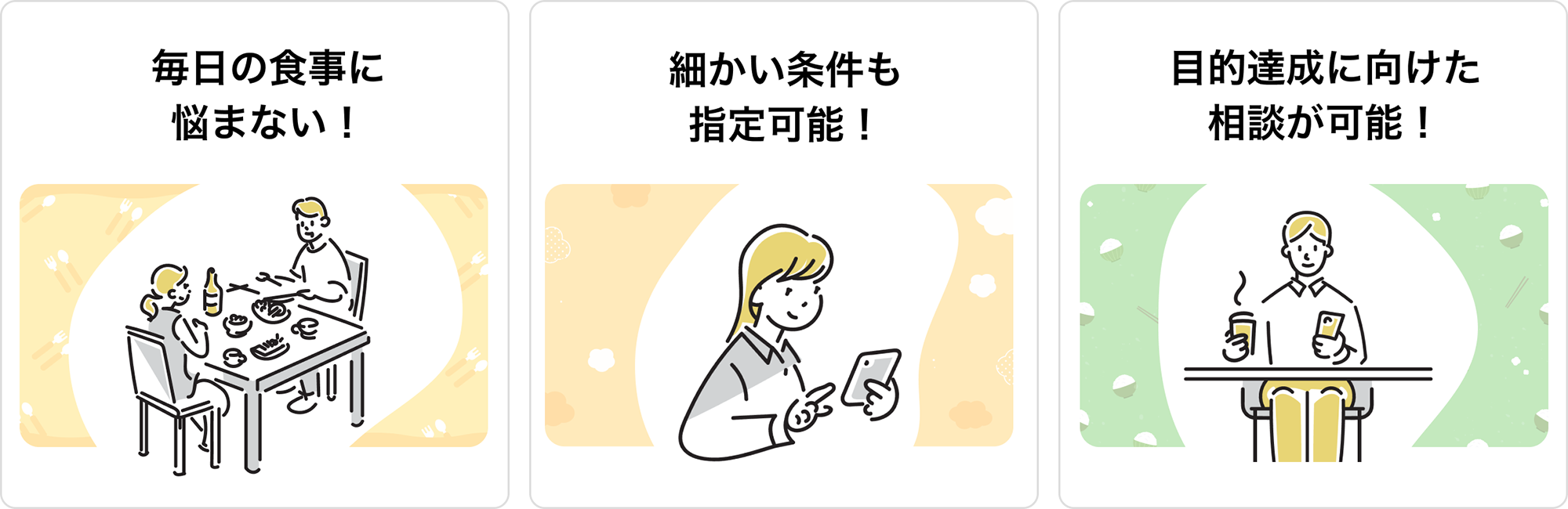 摂取したい栄養素の量や金額を伝えるだけで、ご希望に沿った食事の組み合わせを提案します。