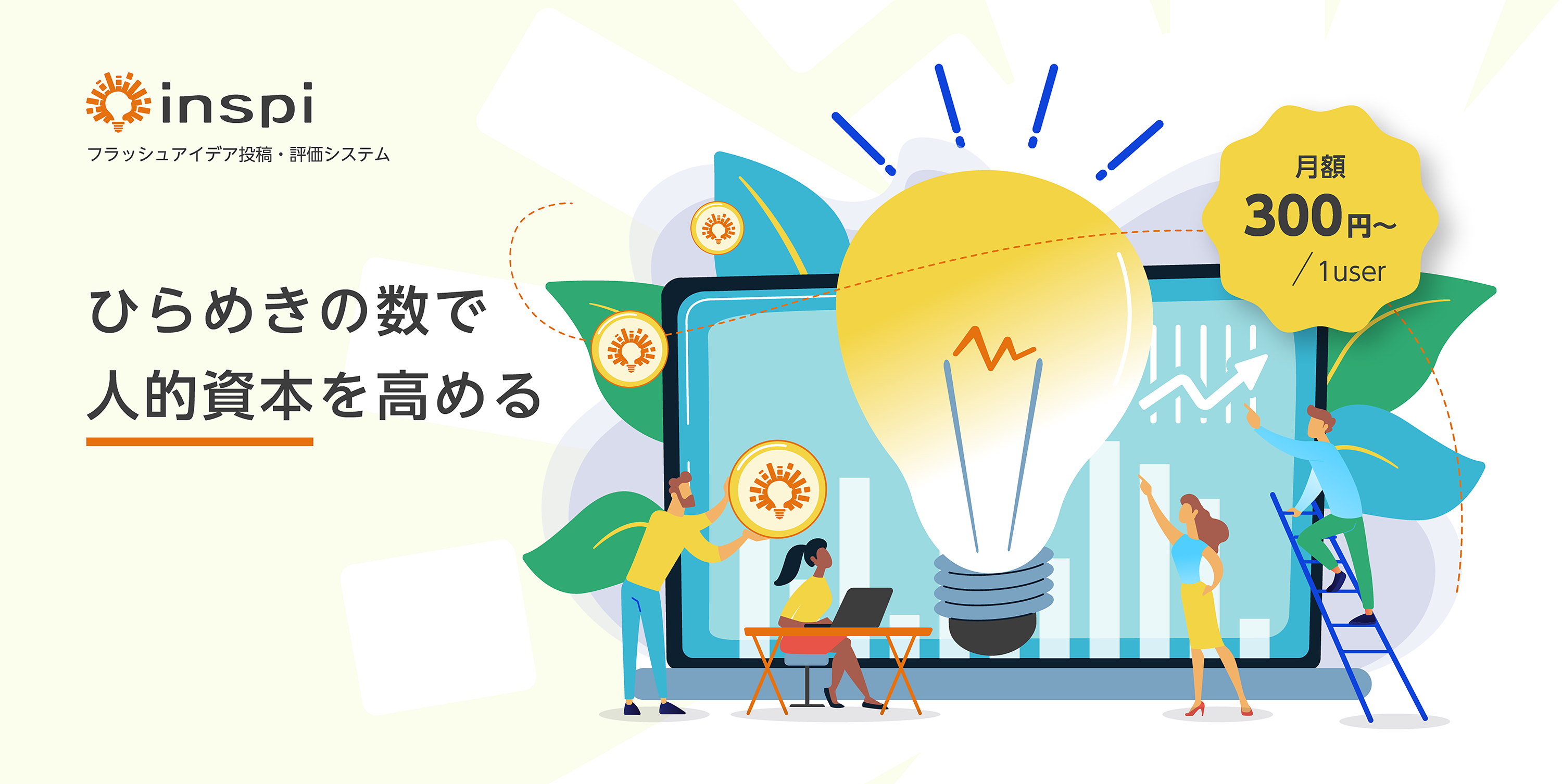 「inspi」は、職場の改善や新しい事業につながるアイデアを従業員から集める事ができると共に、会社が抱える課題を解決し、従業員満足度の向上や離職率の低減などを実現、ひいては人的資本経営の取り組みに貢献することを目指します。
