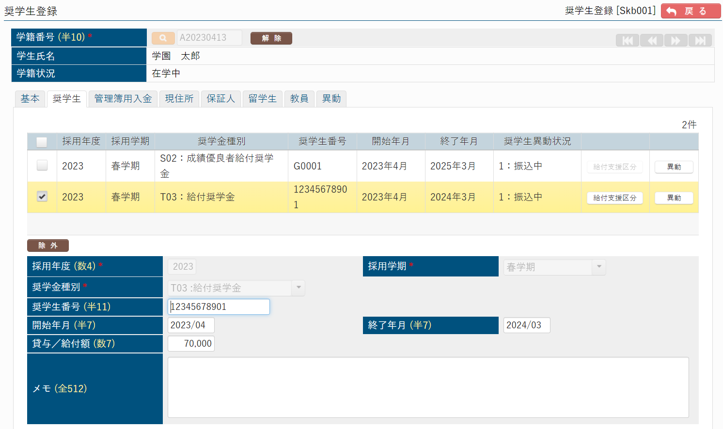 教務情報と連携し学生・保護者・教職員へ奨学金情報を公開することができます。それにより、奨学金担当者・教員は、成績や履修などの各種教務情報と奨学金の種別や採用年度、異動状況といった奨学金情報を組み合わせた受給者管理が可能となっており、奨学金受給が危ぶまれる学生への事前指導など、受給者支援にお役立ていただけます。