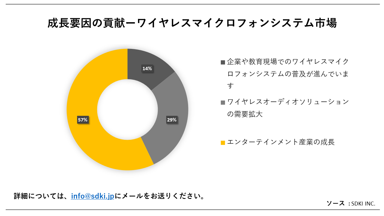 エンターテインメント産業の成長は、ワイヤレスマイクロフォンシステム市場の成長を導く主要な要因です。例えば、あるレポートによると、世界の音楽産業の収益は2020年に215億米ドルと推定され、その中でも音楽ライブイベントが大きな比重を占めています。また、米国における音楽フェスティバルの参加者数は2014年の3290万人から2019年には4360万人に増加しており、ライブエンターテインメント体験への需要が高まっていることが示されています。