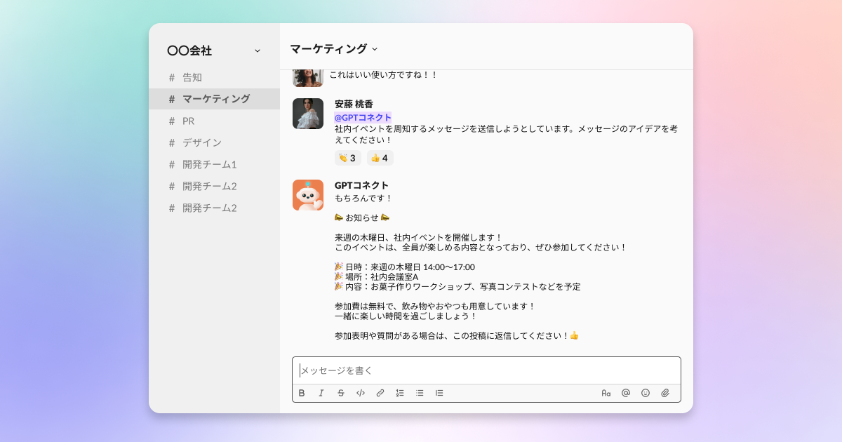 社内チャットに「GPTコネクト」を招待するだけで簡単に導入いただけます。ChatGPTとのやりとりを社内のオープンなコミュニケーションの場で行うことで、従業員のChatGPTに関する知見が増え、スムーズかつ高度なAI活用が期待できます。