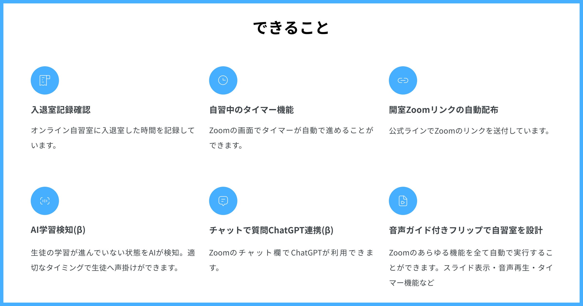 塾運営者向けのサポート: 小規模な学習塾や家庭教師の先生でも簡単にオンライン自習室を運営できるように設計されており、運用面での手間が軽減されます。