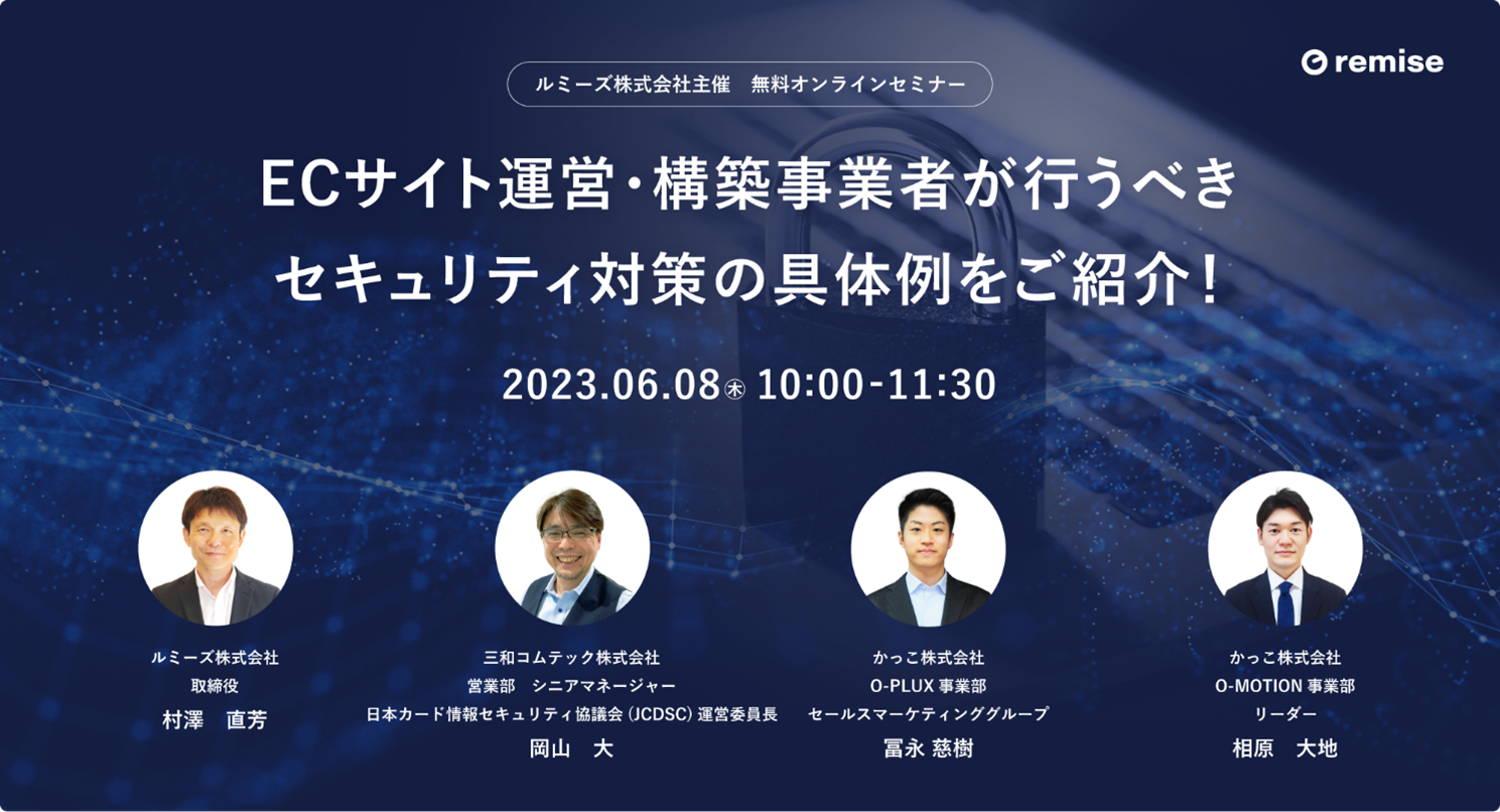 【ルミーズ主催】無料オンラインセミナー|ECサイトのセキュリティ対策具体例 ルミーズでは、2023年6月8日に無料オンラインセミナーを開催。「ECサイト運営・構築事業者が行うべきセキュリティ対策の具体例をご紹介!」セミナーの概要やスケジュール、お申し込みについてはこちらをご確認ください。 |