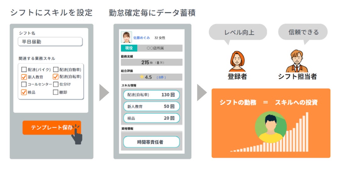 「matchbox」を利用することで事業者はスキルのある人材と効率的にマッチングできるようになり、就業者は自身の実績がデータベースに蓄積されていくので働いた分の技能や信頼を事業者に対し示すことができるようになります。