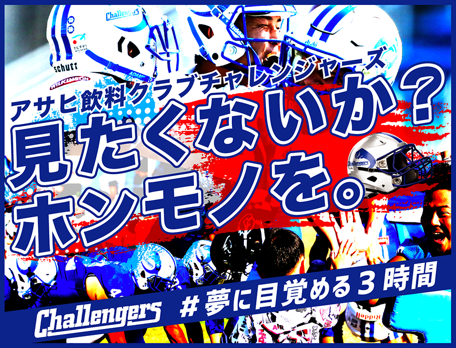 概要:「勇気を持って新しいことに挑戦し続けることにより、日本のトップ・チームであり続ける。」「チャレンジャーズを応援して下さるファンやサポーターに、質の高いプレー、ひたむきな姿勢で応える。」「日本のフットボール界の発展および地域の振興に貢献する。」 この3つの理念に基づいて、強いチームになることを目指して挑戦し続けるアメリカンフットボールクラブを運営している。