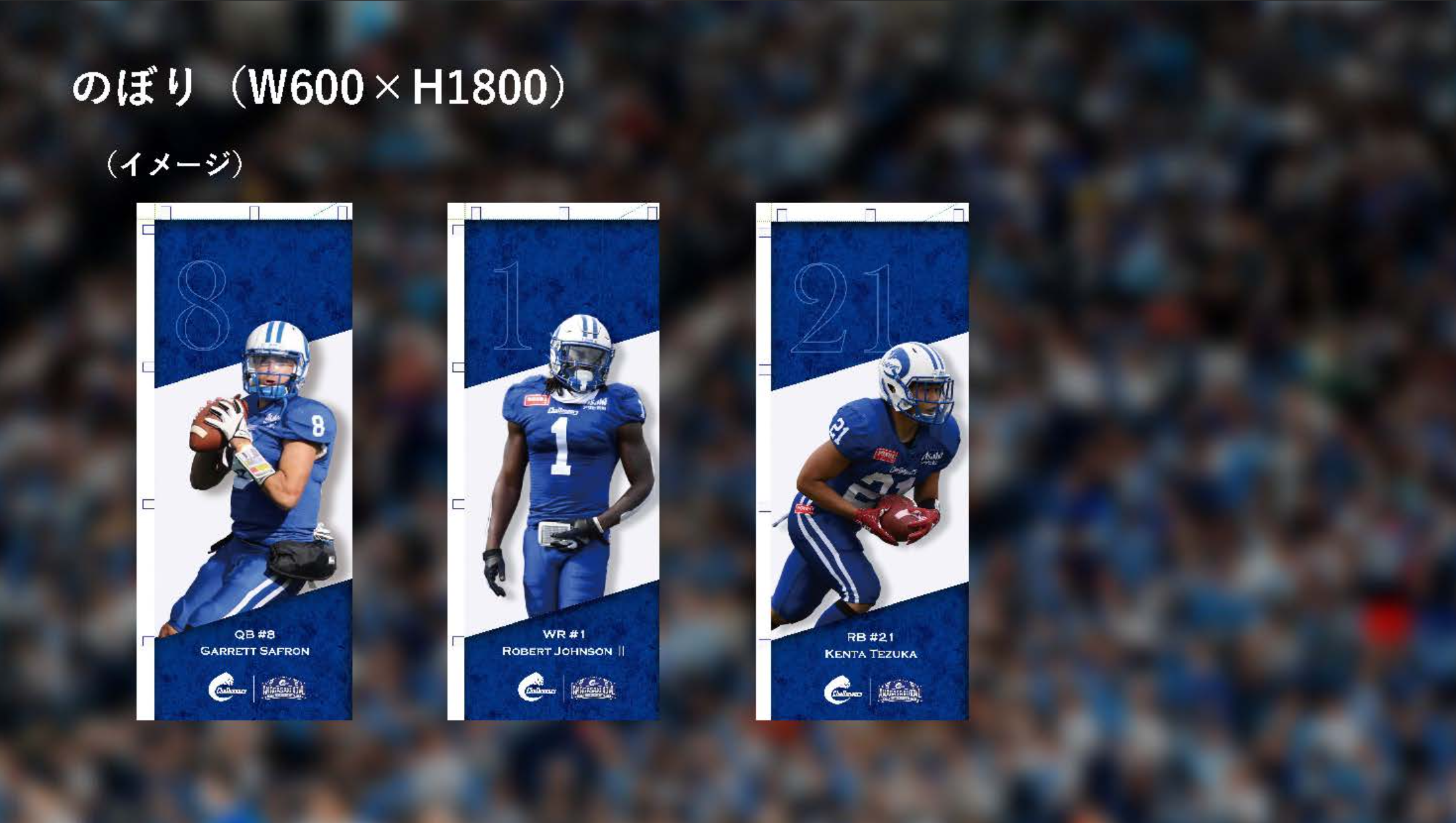 ・お好きな選手のデザインの「のぼり旗」を作成し、尼崎ボウルの際に掲出いたします。