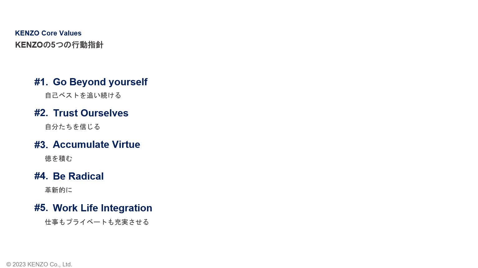 いままでは商品サービス名が社名の大きな部分を締めていましたが、KENZOに変更する事で想像力や総合的な
