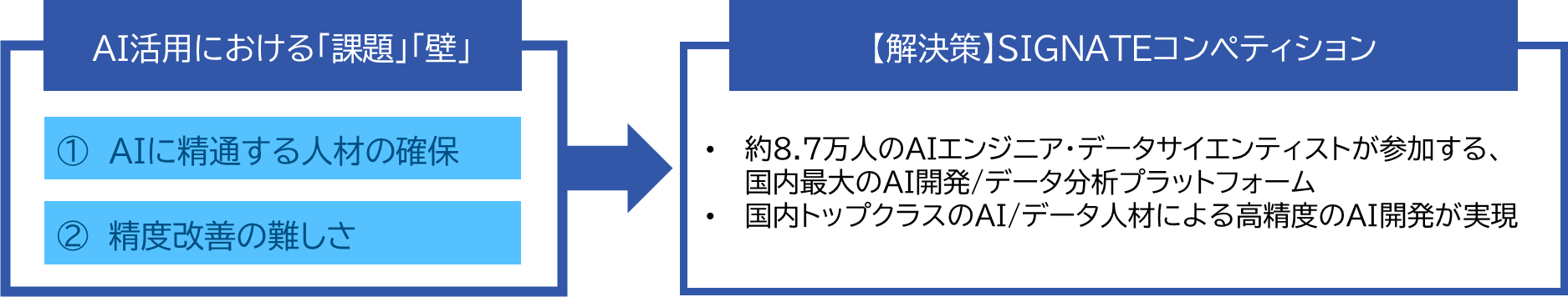 株式会社SIGNATEでは、これら企業のAI課題を解決する1つの処方箋として、AI開発コンペティション(「SIGANTE コンペティション」)を提供しております。