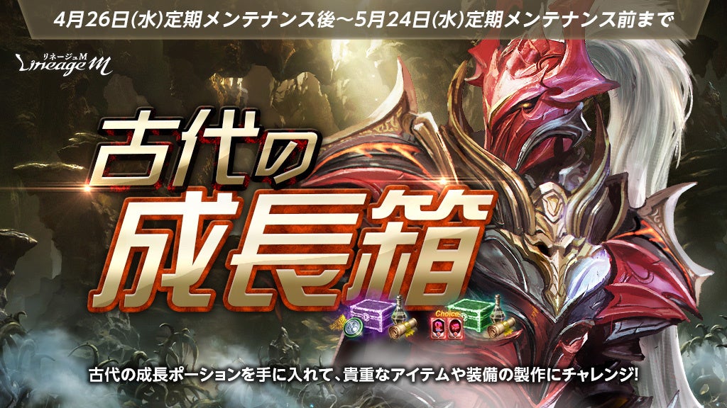使用すると2,000万経験値を獲得し、一定時間経験値ボーナス+50%など複数のバフ効果の付与や、各種製作の材料としても使用することのできる「古代の成長ポーション」が獲得できる「古代の成長箱」と各種パッケージが登場しました。