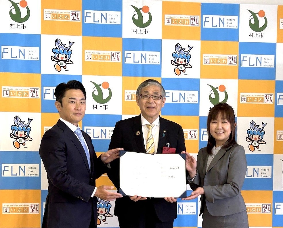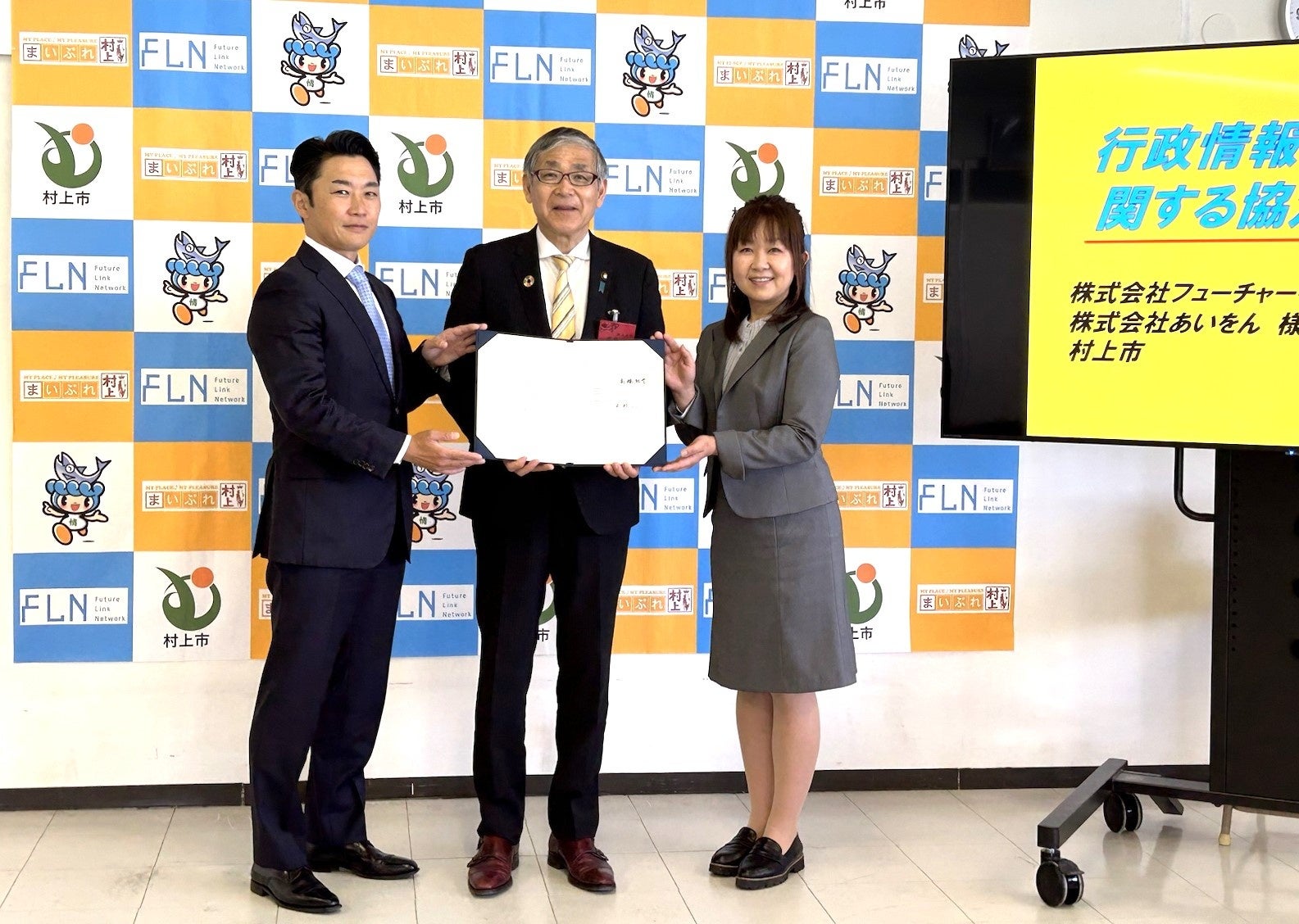村上市 市長 高橋邦芳 株式会社フューチャーリンクネットワーク 代表取締役 石井丈晴 |
