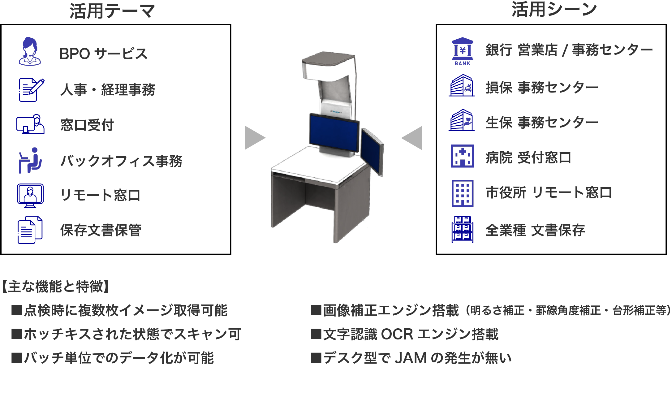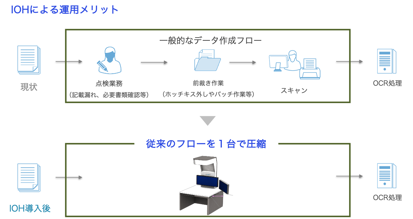 これらの特長から、例えば、面倒なホチキス止めをそのままの状態でスキャンすることで2ページ同時スキャンが可能になることや、原本帳票の事務点検を自動化することで、従来のオーバーヘッドスキャナーとは一線を画した効率的な事務オペレーションを実現します。
