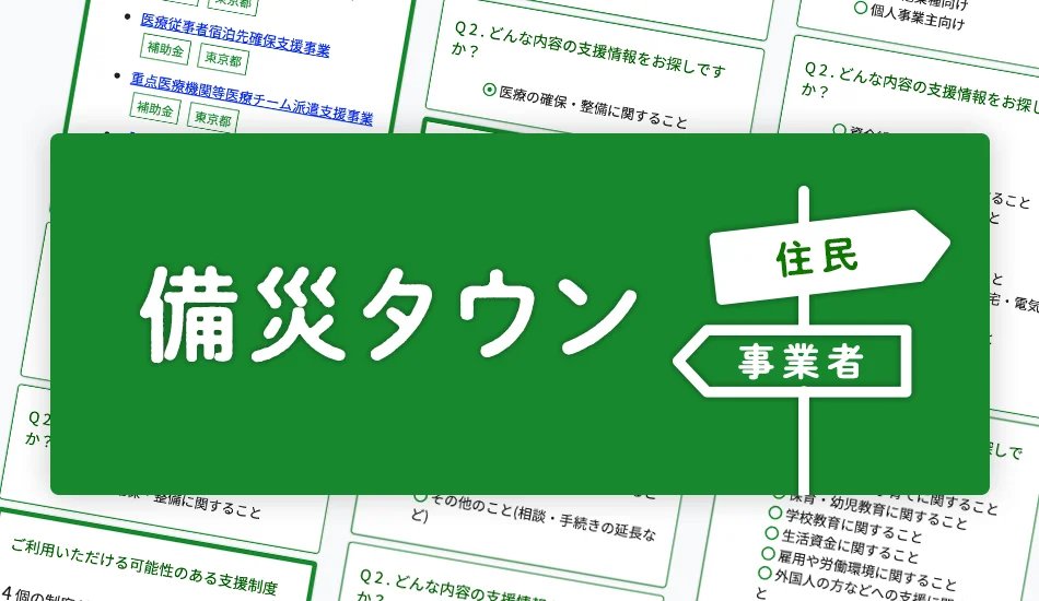 『備災タウン』は、災害が起きた時に、住民や事業者がそれぞれの状況に応じて受けられる支援制度情報を集約したサイトです。ユーザーである被災者目線で支援制度を探せるように、「困っていること」「受けたい支援」など、被災状況や要望に合わせた切り口での検索機能を用意しました。また、制度の説明は住民・事業者が制度を理解しやすいように、馴染みが薄い法律用語や法令文をそのまま利用せず、わかりやすい表現に修正しています。
