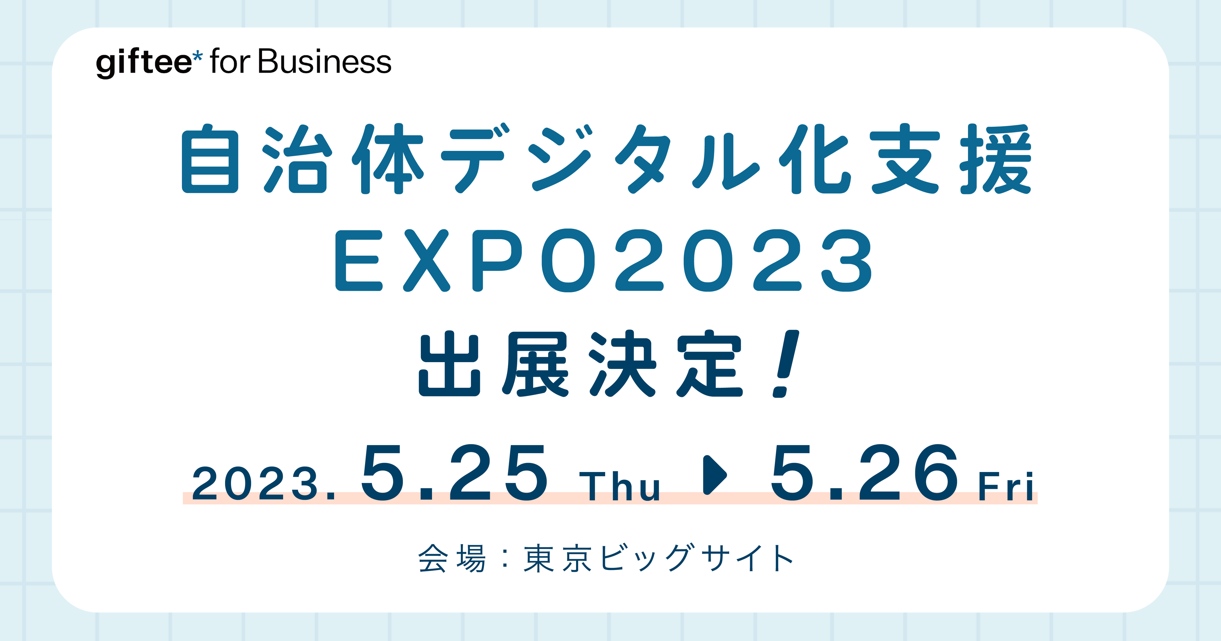 eギフトプラットフォーム事業(※1)を展開する株式会社ギフティ(本社:東京都品川区/代表取締役:太田 睦、鈴木 達哉/以下、ギフティ)は、デジタルギフトを活用した法人向けサービス「giftee for Business」を、2023年5月25日(木)〜26日(金)の期間、東京ビッグサイトで開催される自治体DXの専門展示会「自治体デジタル化支援EXPO2023」(主催:デジタル化・DX推進展 実行委員会)にブース出展することをお知らせいたします。
