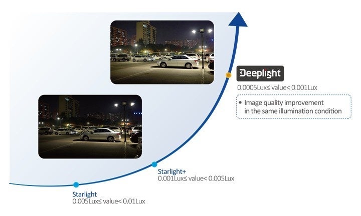 スターライトとスターライト+からアップグレードされた、低照度における画質向上技術であるディープライトは、ディープラーニングアルゴリズムを使用して映像を処理するためノイズを低減し夜間でもクリアで鮮やかな色再現性の高い映像を実現します。