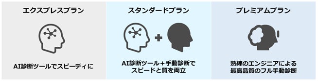 本サービスでは、AI診断ツールによりこれまでにない診断スピードと低コストを実現した「エクスプレスプラン」、従来お客様から好評いただいている分かりやすい診断レポートはそのままに、AI診断ツールとエンジニアによる手動診断を併用することで品質とスピードの両方を向上させた「スタンダードプラン」、熟練のエンジニアによるフル手動でのきめ細やかな診断に加え、オプションで特殊プロトコル(WebSocketやGraphQL)の診断やコードレビューの併用も可能な「プレミアムプラン」の3プランをラインアップいたします。