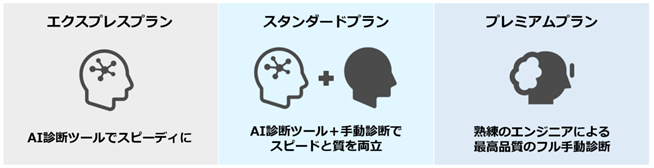 本サービスでは、AI診断ツールによりこれまでにない診断スピードと低コストを実現した「エクスプレスプラン」、従来お客様から好評いただいている分かりやすい診断レポートはそのままに、AI診断ツールとエンジニアによる手動診断を併用することで品質とスピードの両方を向上させた「スタンダードプラン」、熟練のエンジニアによるフル手動でのきめ細やかな診断に加え、オプションで特殊プロトコル(WebSocketやGraphQL)の診断やコードレビューの併用も可能な「プレミアムプラン」の3プランをラインアップいたします。