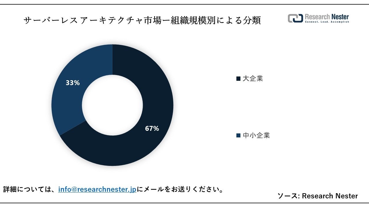 当社のサーバーレス アーキテクチャ市場調査によると、市場は、大企業と中小企業の組織規模別に需要と供給についてセグメント化および分析されています。そのうち、大企業セグメントは2035年末までに最高の収益を獲得すると予想されています。市場の成長は、大企業の数の増加に起因する可能性があります。2021 年には、2020 年の約 337,520 から増加して、250 人以上の従業員を持つ大企業が世界中で約 351,519 になると予測されました。したがって、サーバーレス アーキテクチャの採用が増加しています。大企業は、サーバーレス アーキテクチャを介してトラフィックや需要の予期せぬ突然のスパイクを処理できます。