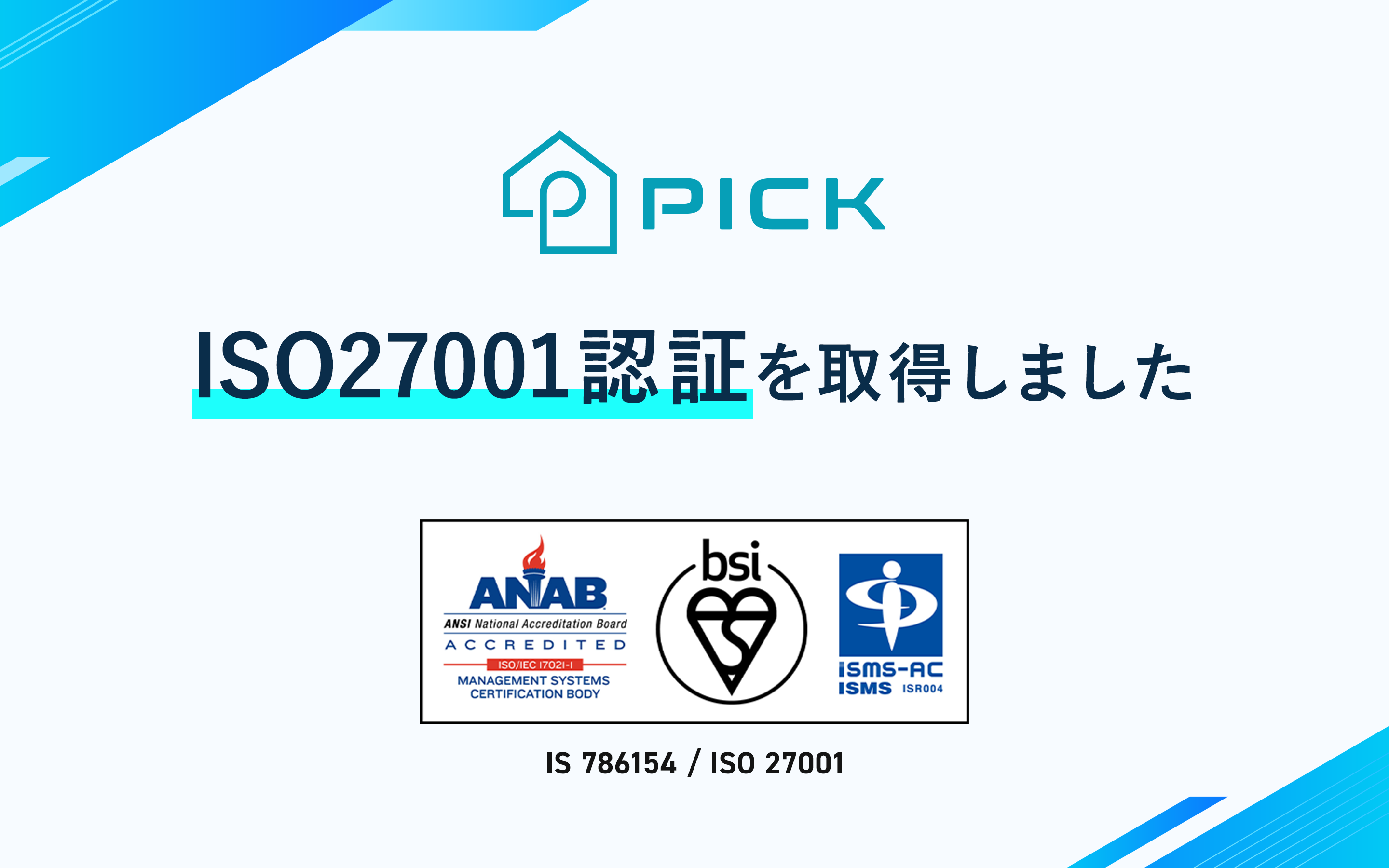 株式会社PICKは、ISO27001の認証を取得し、厳格なセキュリティ基準の下運用を行っております。この認証は日本を代表するセキュリティ企業などでも登録を行っている国際規格であり、一般的なWeb上でのセキュリティやクラウドサービスの提供に問題がない場合に取得することができます。サービスを提供する事業者として、ご利用企業様の重要な情報を取り扱う上で、信頼の証となるISO27001の認証による情報セキュリティ管理体制を構築することは必須であると考え、今回の認証取得に至りました。