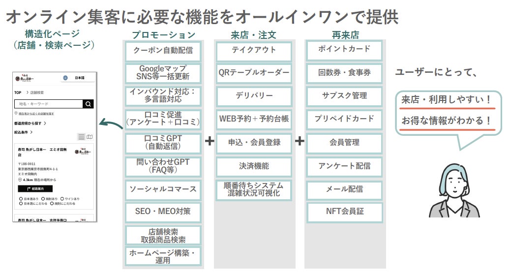 チェーン展開している店舗事業者様のDX支援サービスを展開しています。集客から注文、再来店までトータルでサービス提供しており、お好きなオプション機能から始められます。