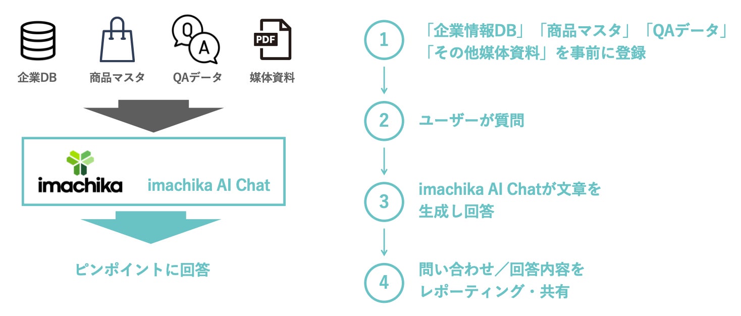 imachika AI Chat は、顧客向け問い合わせ対応だけでなく、社内ノウハウ共有、調べもので利用する媒体資料など、あらゆるデータを統合し、ピンポイントで回答できるサービスです。