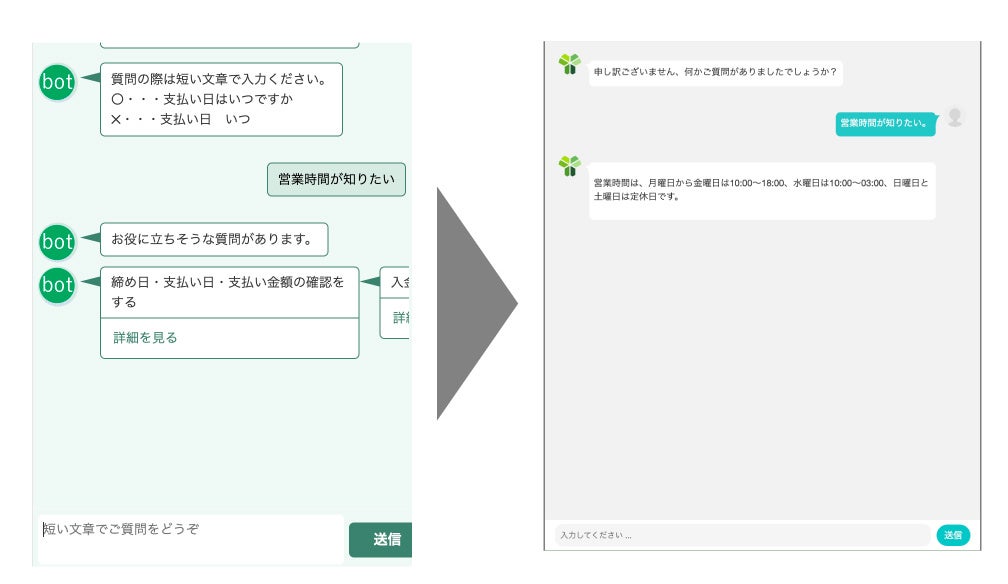 →今までのチャットボットは、営業時間を質問しても複数の回答候補を提示することしかできませんでした。imachika AI Chat なら、ピンポイントで回答内容が提示されます。
