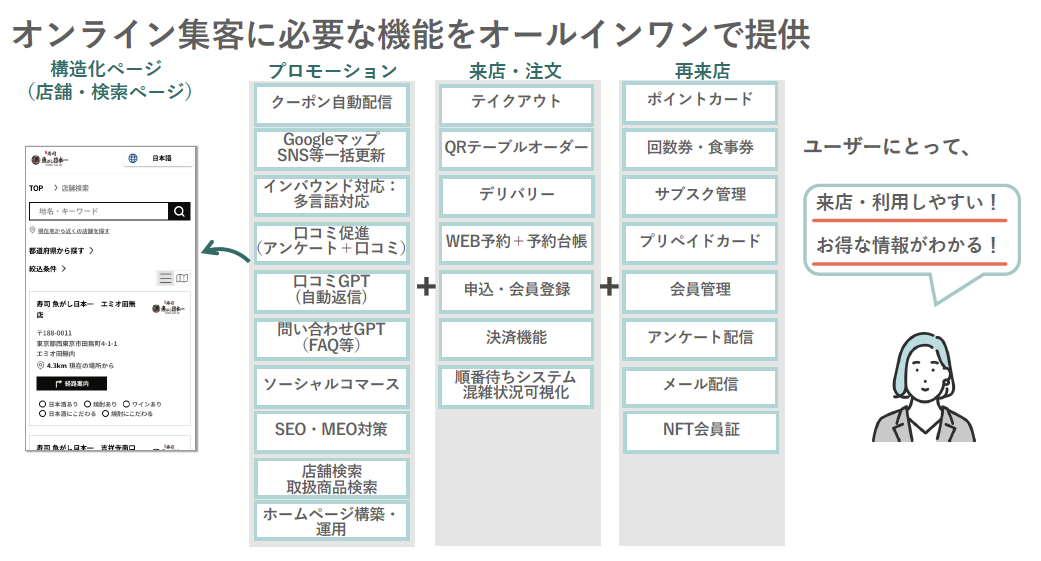 チェーン展開している店舗事業者様のDX支援サービスを展開しています。集客から注文、再来店までトータルでサービス提供しており、お好きなオプション機能から始められます。
