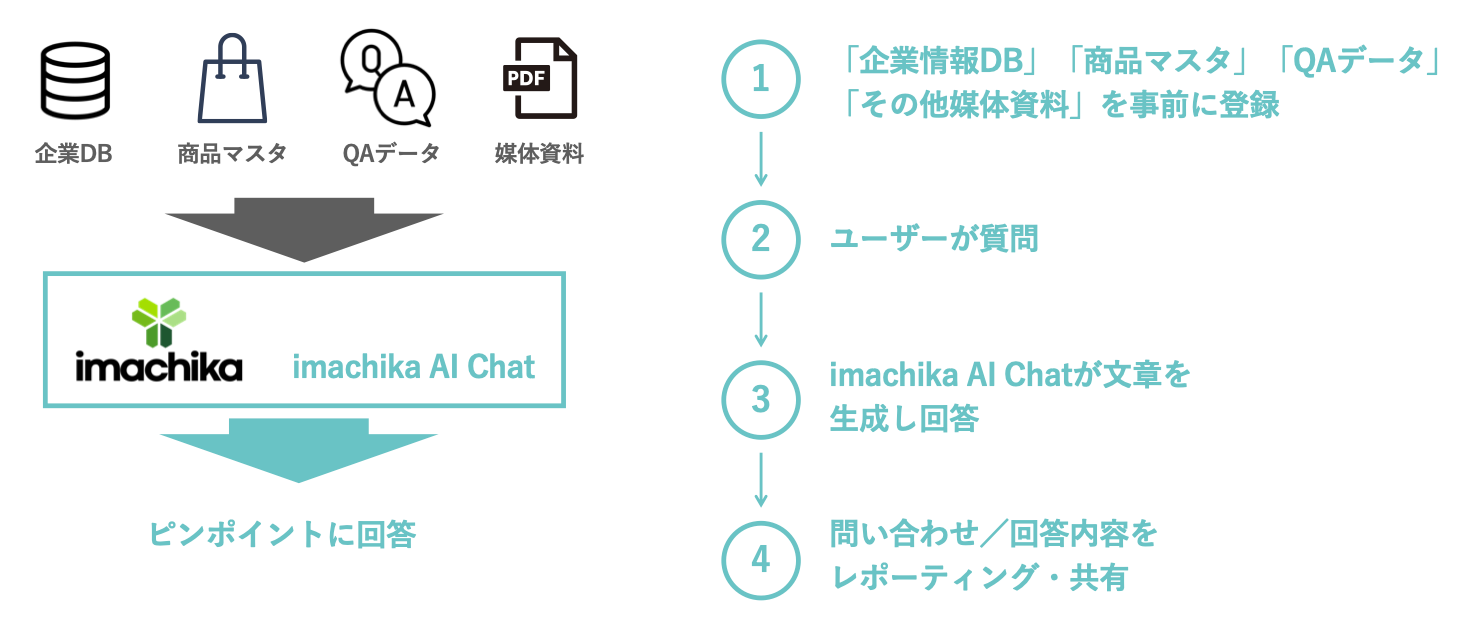 imachika AI Chat は、顧客向け問い合わせ対応だけでなく、社内ノウハウ共有、調べもので利用する媒体資料など、あらゆるデータを統合し、ピンポイントで回答できるサービスです。