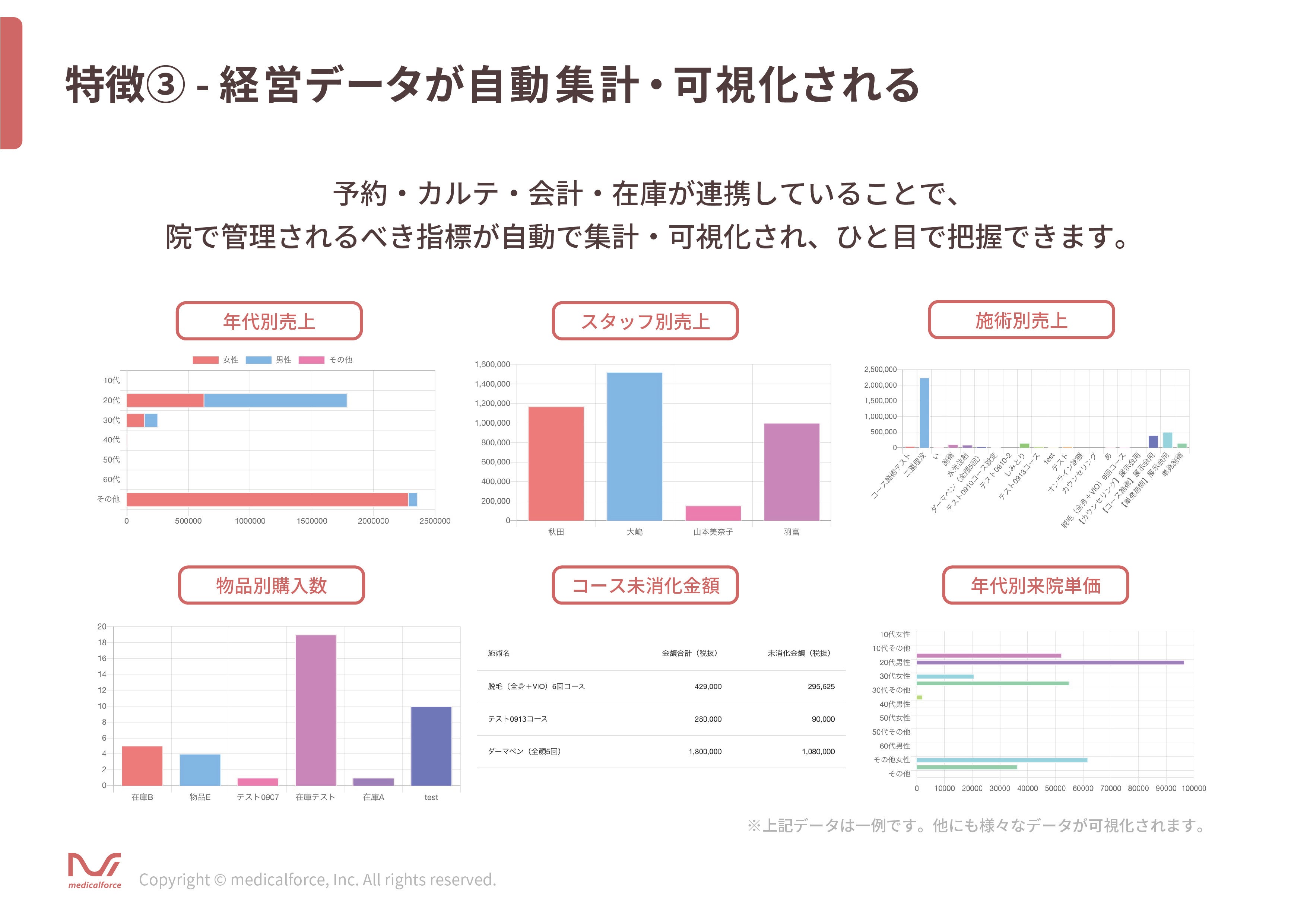 従来、美容クリニックでは機能ごとに異なるツールやシステムを利用していたため、業務のミスが起きやすい環境下にありました。「medicalforce」は複数の機能を一つに統合することで業務のミスを少なくしつつ、患者様の顧客体験を高めることができます。また、クリニック業務の円滑化だけをゴールとせず、経営管理のダッシュボードやCRM機能で、集客強化なども含めたクリニック運営全体のサポートをいたします。