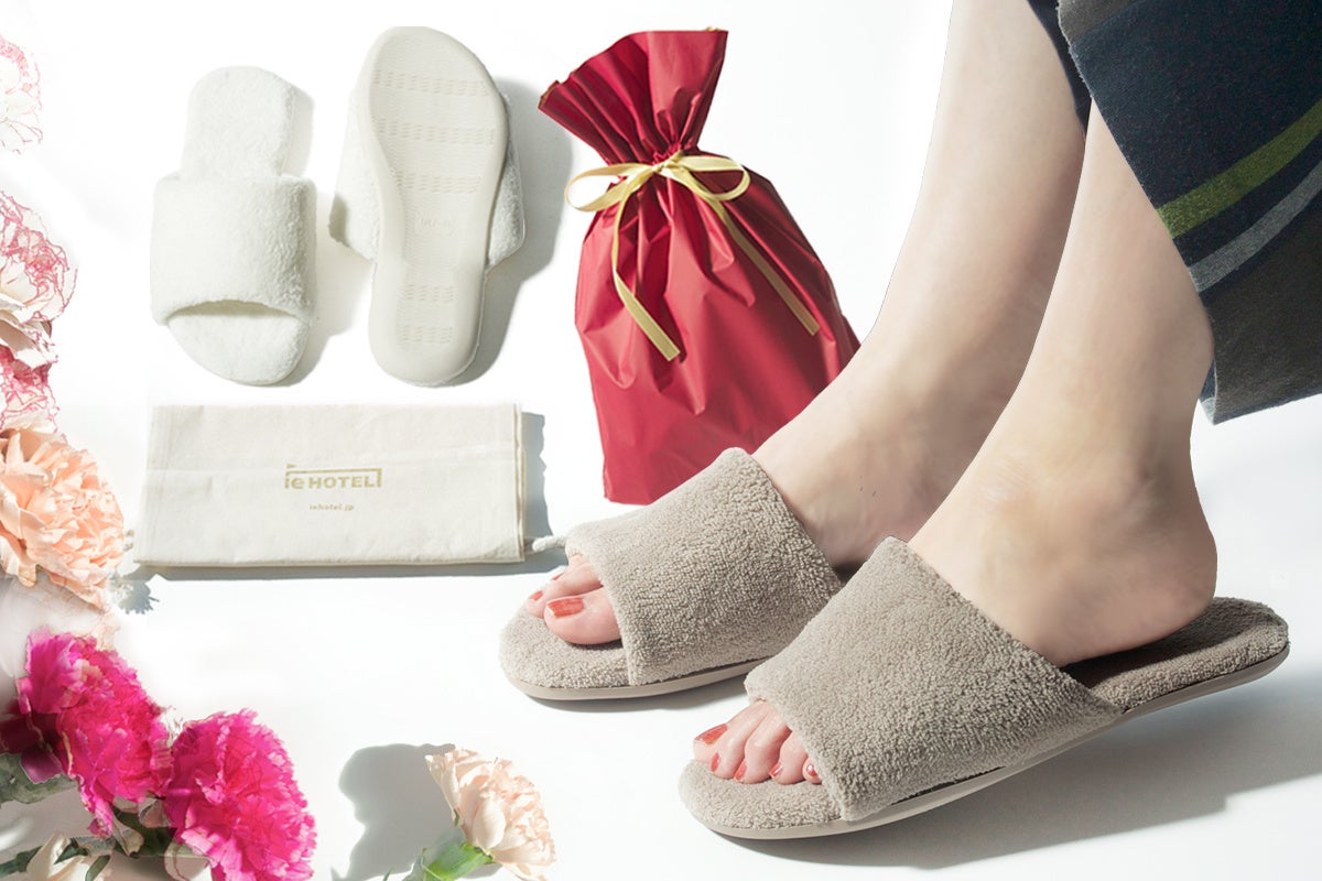 そして、「家をホテルに ホテルを家に」するブランド 「ie HOTEL」のオリジナルオーガニック巾着バックの中に、タオル地スリッパを入れました。是非、旅行や外出時にもご利用いただけると嬉しいです。さらに母の日のプレゼントとして最適な赤巾着リボン袋でラッピングしてお届けします!