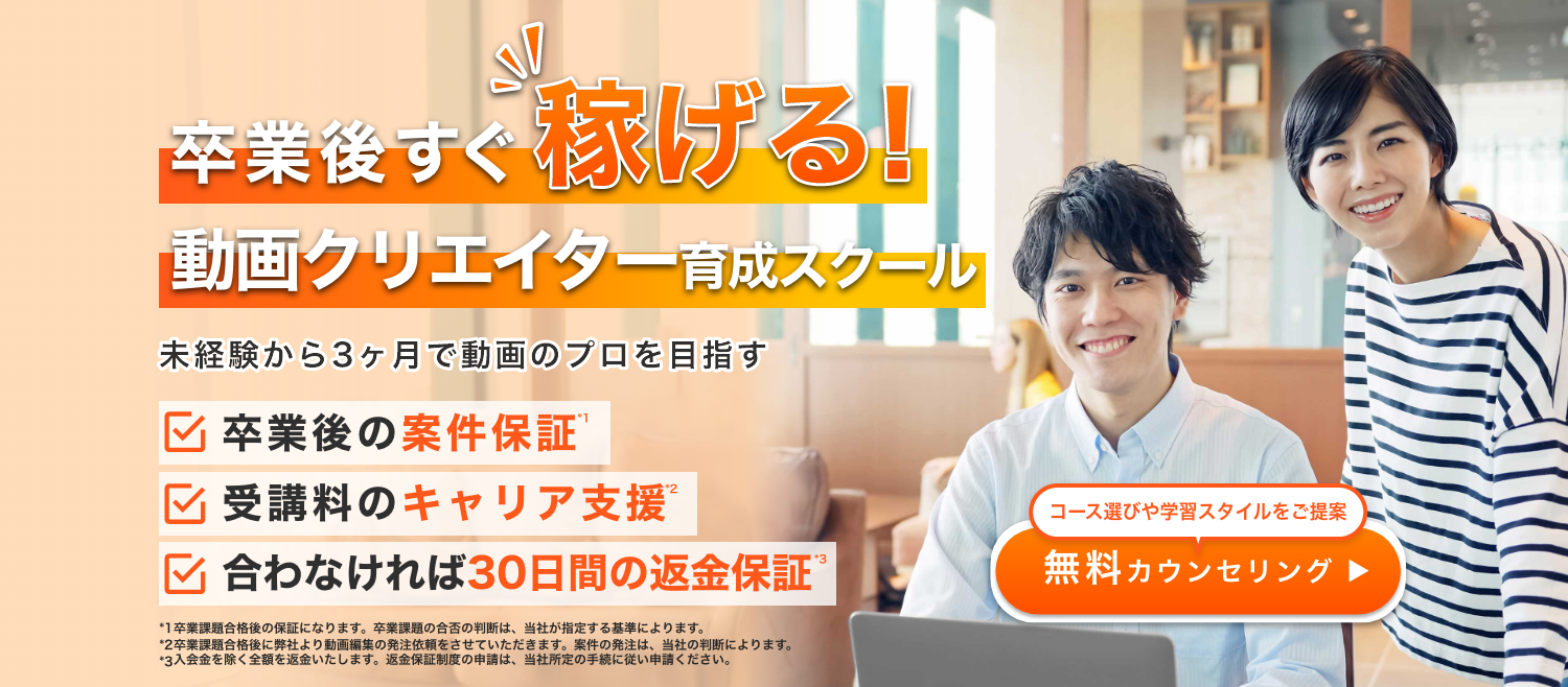 卒業課題をこなしたら弊社より受講いただいたコースに応じて案件を発注させていただきます。弊社が企業ブランディング動画のコンサルティングをしておりますので、弊社より動画編集を依頼することができます。(単価:1本最低5,000~15,000円)受講料相当額について、将来の受注により受講料を全額回収できる可能性もあります。