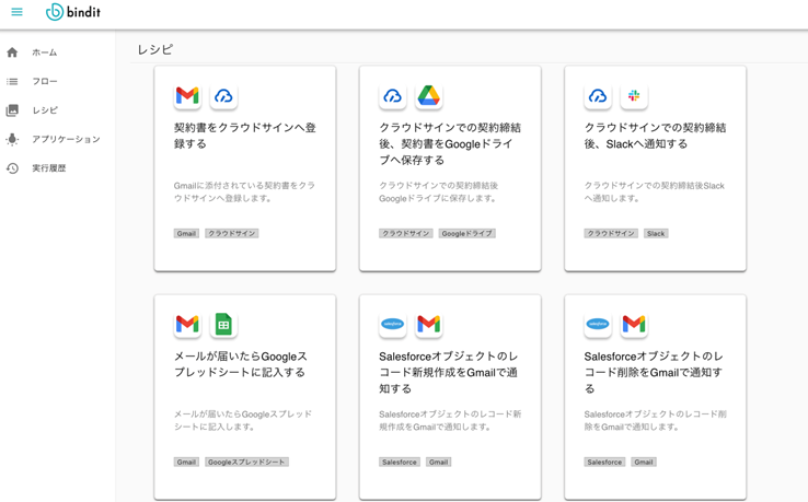 「bindit」は、ITの専門的な知識を持っていない人事、経理などのバックオフィス部門の担当者でも「レシピ」という連携アセットを簡単に設定するだけでアプリケーション連携や自動化を実現することができます。