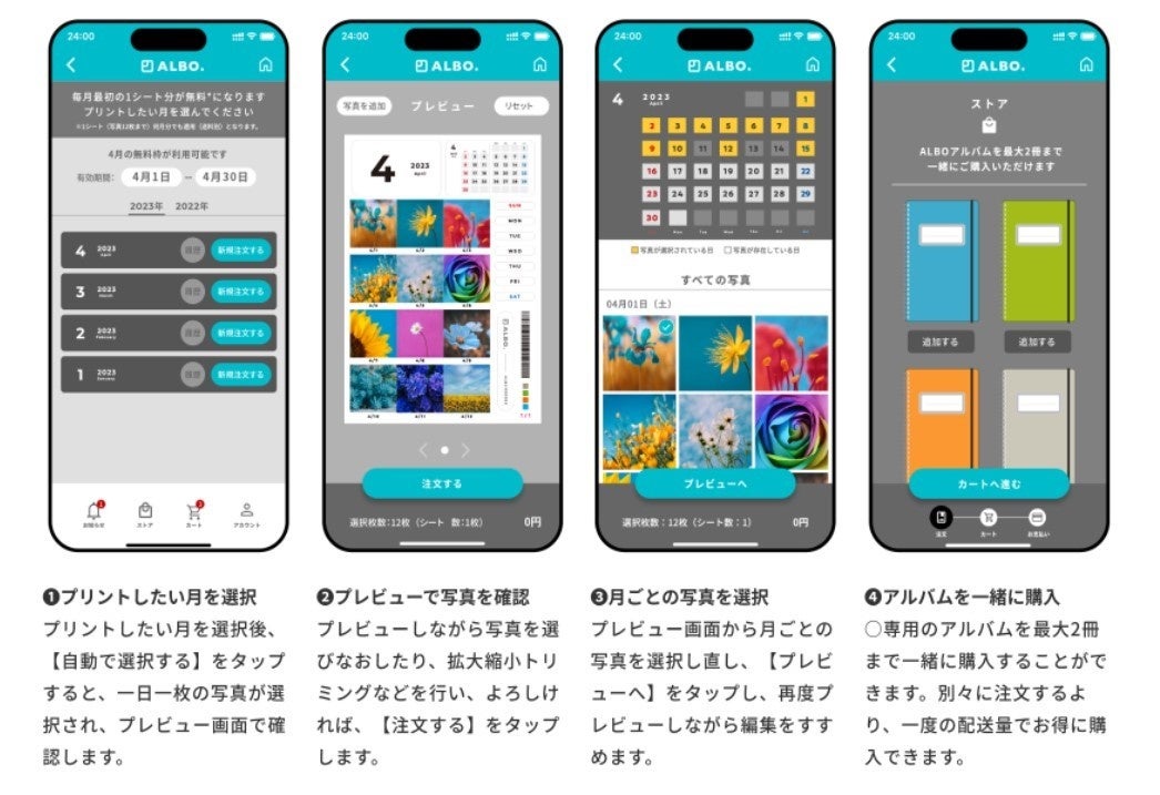 ALBOは現在iOSにてダウンロードすることが可能です。月毎に写真を選び、シールプリントのプレビュー画面を見ながら編集し確認できたら注文します。月が変わると新しい月が表示され編集を開始することができます。また、前の年の1月まで遡って1年間分を注文することもできます。