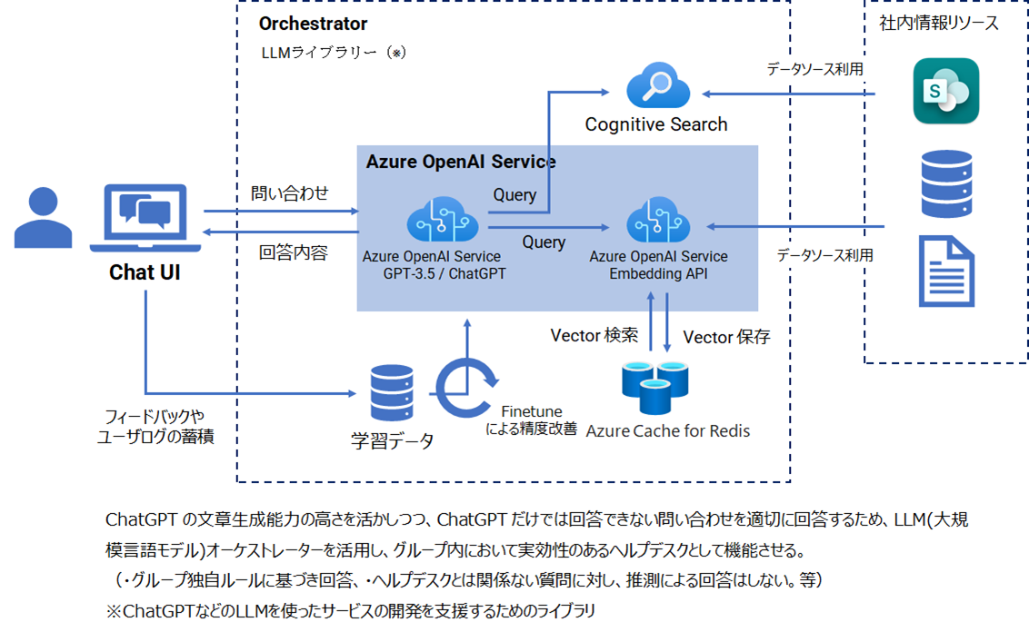 ③自社内ヘルプデスクでのAzure OpenAI ServiceのAPI活用による実証実験と実用ノウハウ蓄積(構成は図1を参照)