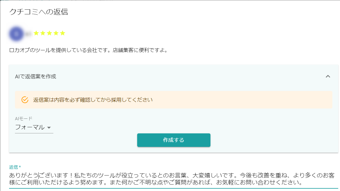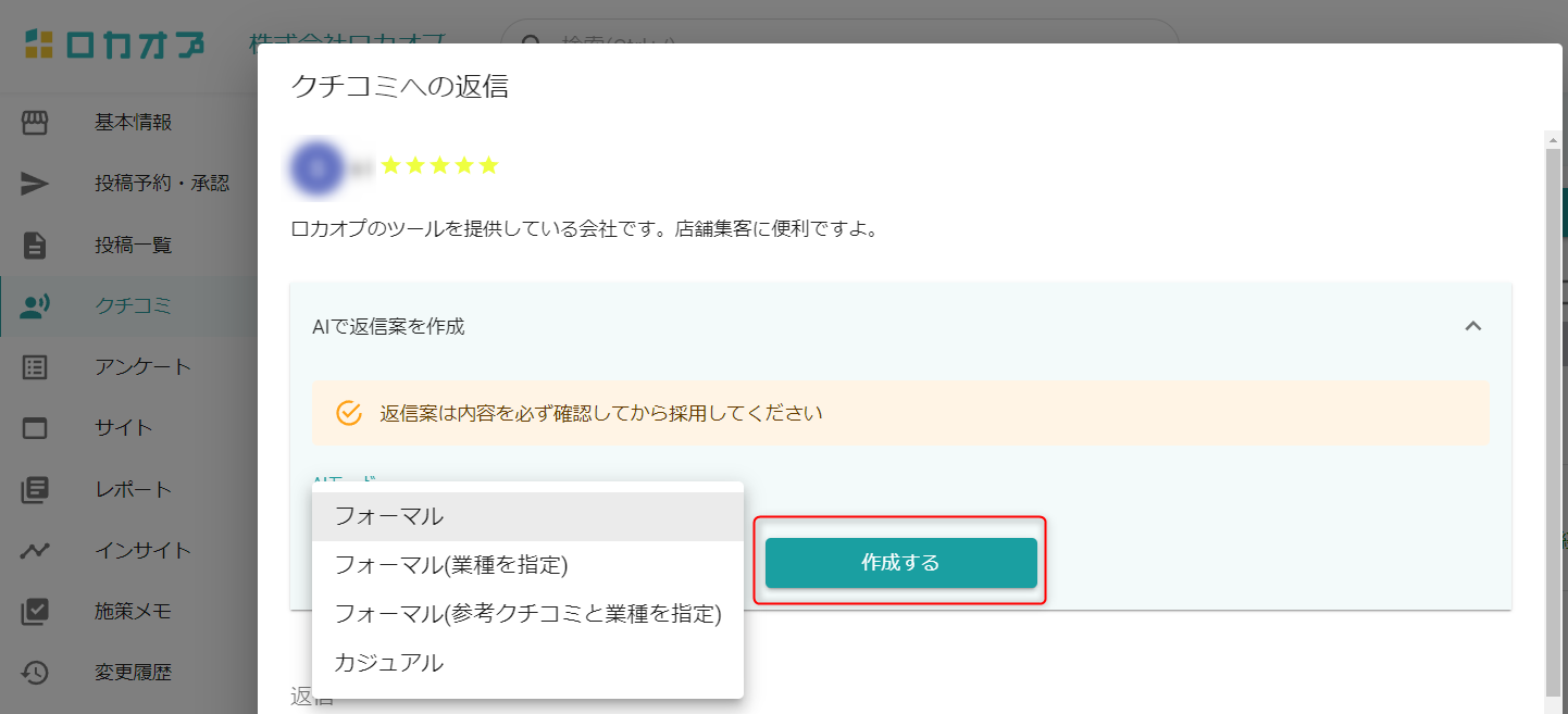 AIモード「フォーマル(業種を選択)」「フォーマル(参考クチコミと業種)」を選び、AIに学習させることで、より精度の高いクチコミ返信案を生成できます。