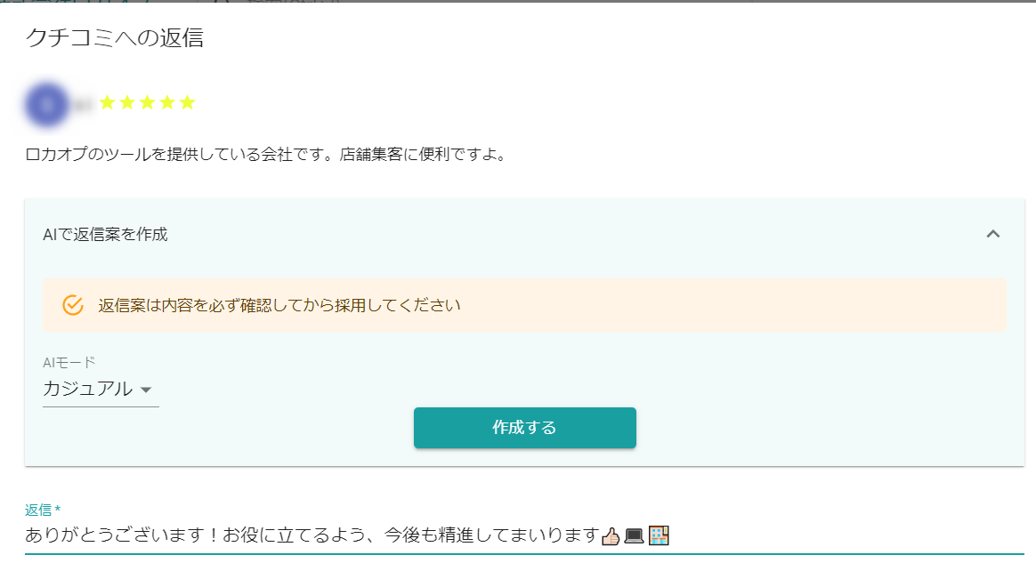 この機能は、ロカオプサービスをご契約された店舗様、事業者様のGoogleビジネスプロフィールに届いたクチコミ(以下、Googleクチコミ)への適切な返信案をAIがあなたと一緒に考えてくれます。