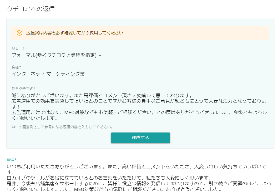 ・「フォーマル」「カジュアル」の返信スタイルを指定することで業態に合ったクチコミ返信案を簡単か瞬時にご提案いたします。