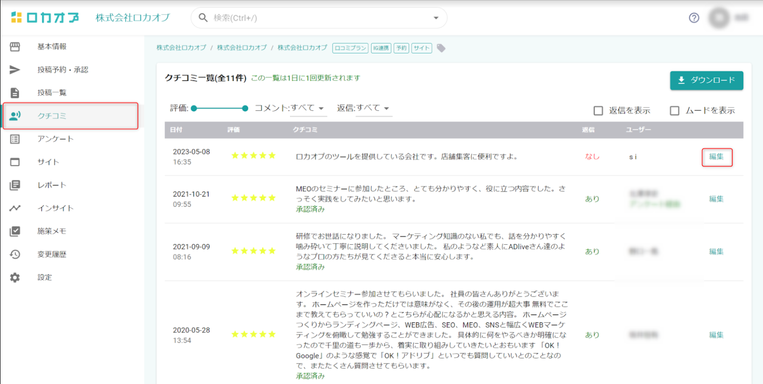 管理画面ダッシュボード「クチコミ」のタブから返信したいクチコミの右にある「編集」をクリック