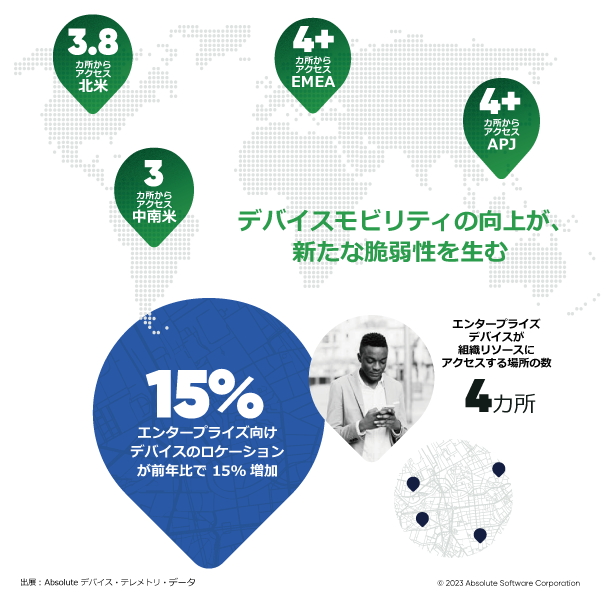 リモートワークの一般化に伴い、デバイスのロケーションは前年比で15%増加している。エンタープライズデバイスが組織リソースにアクセスするのは平均4カ所から