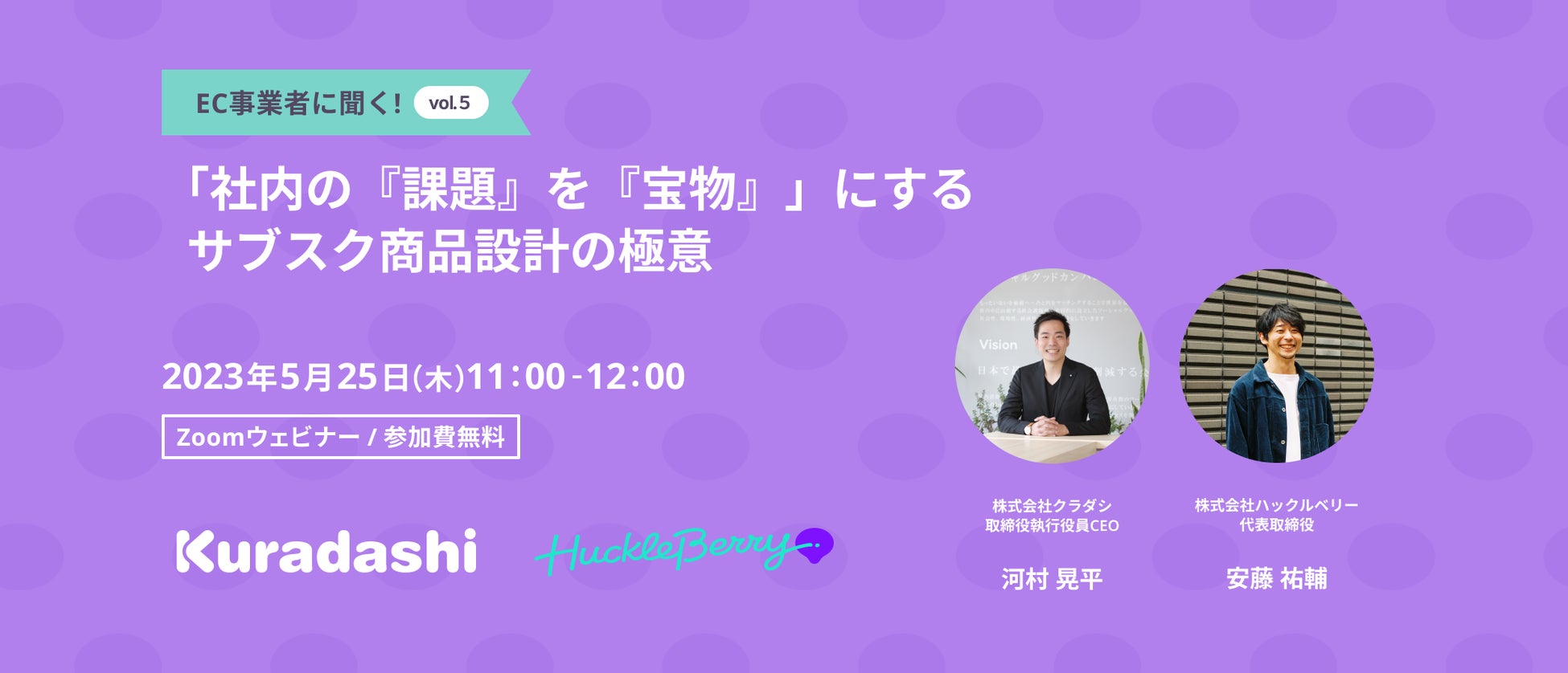 クラダシ × ハックルベリー共催オンラインイベント「社内の『課題』を『宝物』にするサブスク商品設計の極意」を5月25日に開催