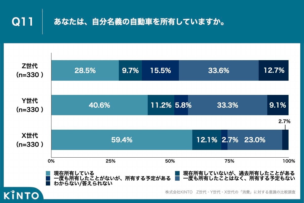 Q11. 自分名義の自動車、X世代は約6割が現在所有しているのに対し、Y世代は4割、Z世代は3割未満という結果に