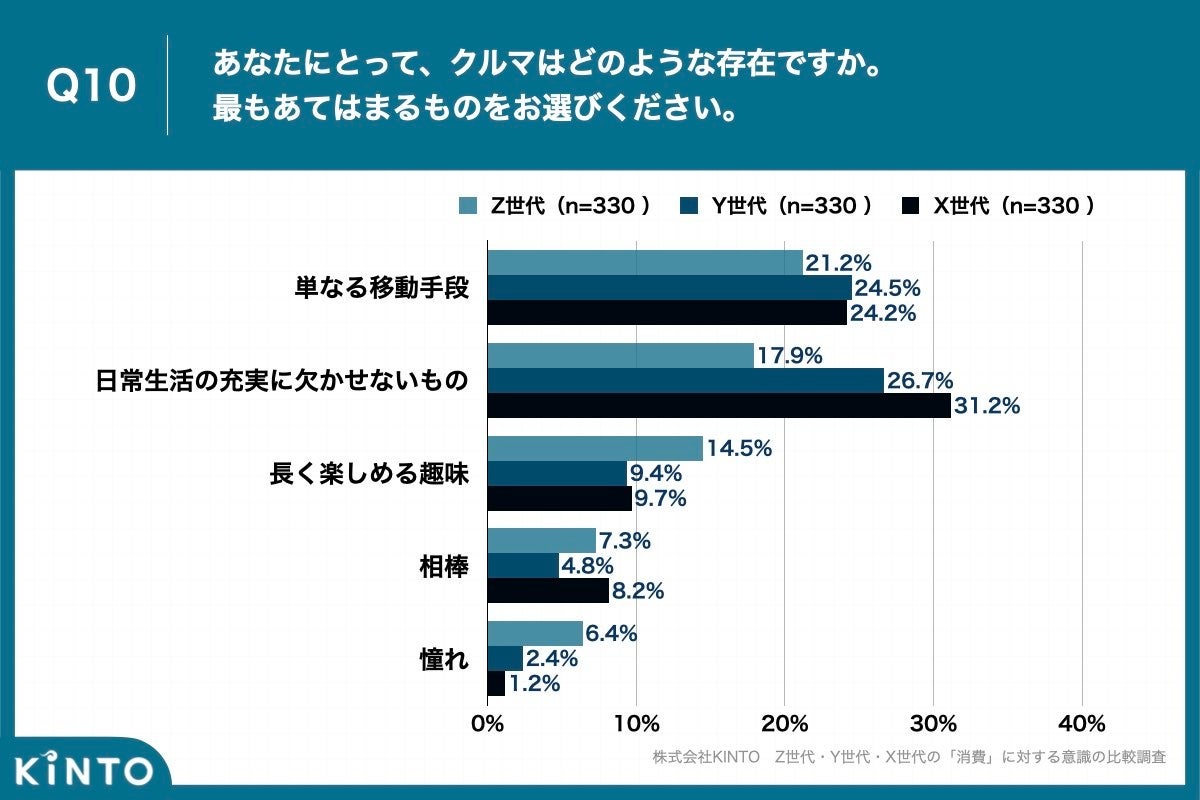 Q10. クルマの存在、Z世代は「単なる移動手段」、XY世代は「日常生活の充実に欠かせないもの」